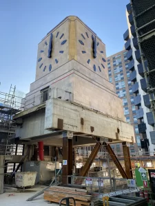 He said the clock tower was temporarily supported by over 1400 tonnes of structural steel. This allowed the builder, Multiplex, to demolish the existing floors and excavate the sandstone underneath to create a new basement for the Shell House building and restore the clock tower while leaving it suspended above the live construction site.